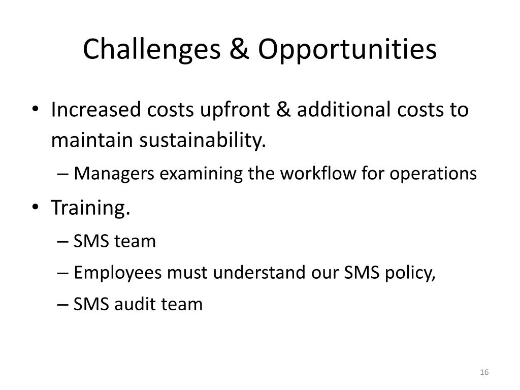 Challenges & Opportunities • Increased costs upfront & additional costs to maintain sustainability. • Managers examining the workflow for operations • Training. • SMS team • Employees must understand our SMS policy, • SMS audit team