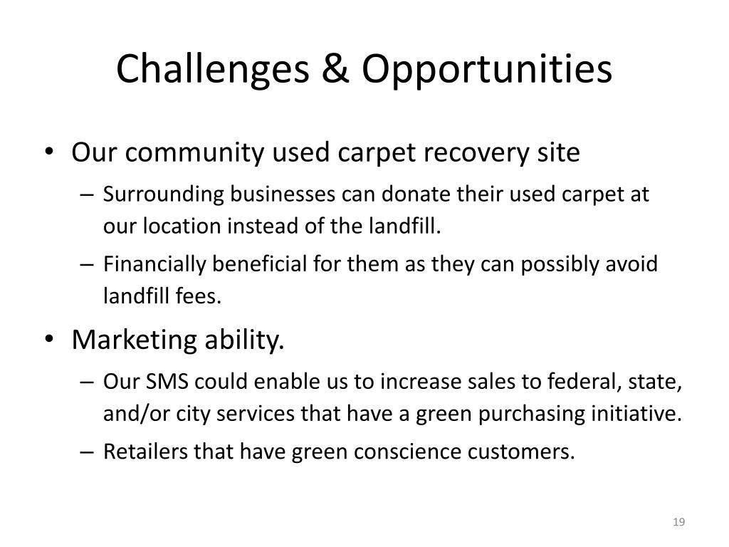 Challenges & Opportunities • Our community used carpet recovery site • Surrounding businesses can donate their used carpet at our location instead of the landfill. • Financially beneficial for them as they can possibly avoid landfill fees. • Marketing ability. • Our SMS could enable us to increase sales to federal, state, and/or city services that have a green purchasing initiative. • Retailers that have green conscience customers.