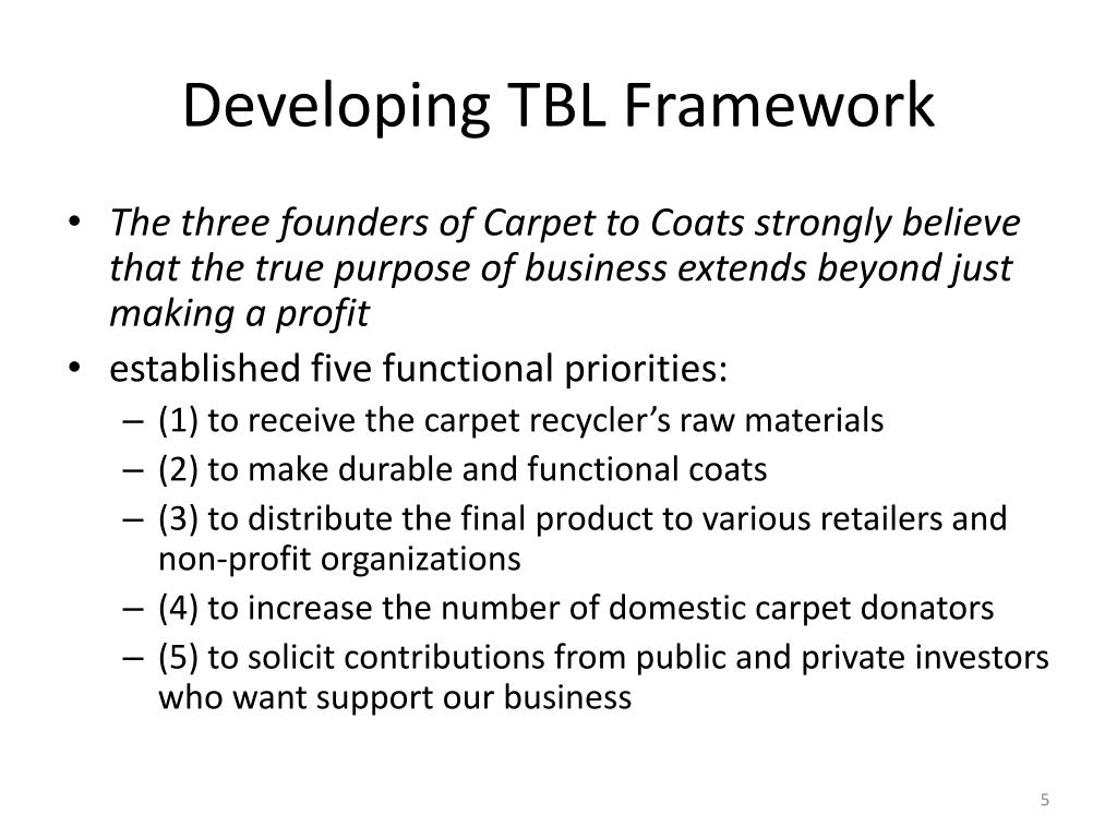 Developing TBL Framework • The three founders of Carpet to Coats strongly believe that the true purpose of business extends beyond just making a profit • established five functional priorities: • (1) to receive the carpet recycler’s raw materials • (2) to make durable and functional coats • (3) to distribute the final product to various retailers and non-profit organizations • (4) to increase the number of domestic carpet donators • (5) to solicit contributions from public and private investors who want support our business