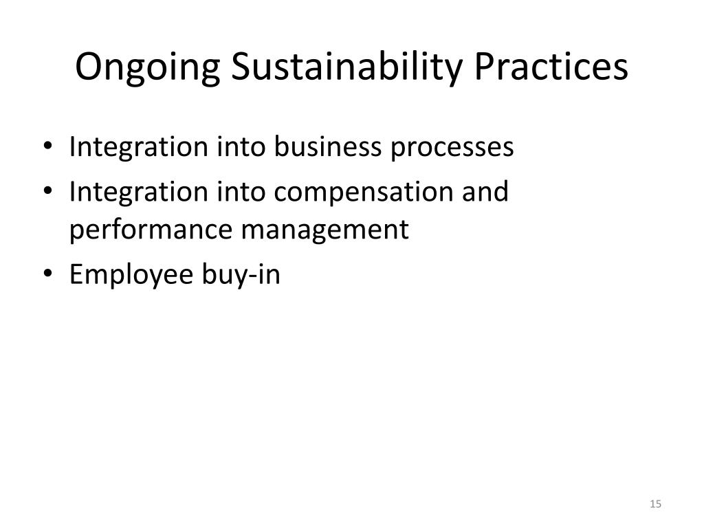 Ongoing Sustainability Practices • Integration into business processes • Integration into compensation and performance management • Employee buy-in