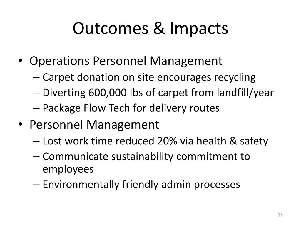 Outcomes & Impacts • Operations Personnel Management • Carpet donation on site encourages recycling • Diverting 600,000 lbs of carpet from landfill/year • Package Flow Tech for delivery routes • Personnel Management • Lost work time reduced 20% via health & safety • Communicate sustainability commitment to employees • Environmentally friendly admin processes