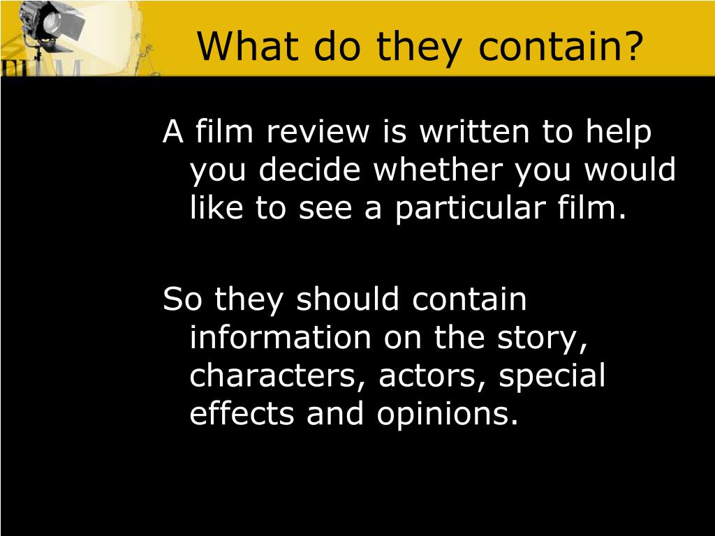 What do they contain? A film review is written to help you decide whether you would like to see a particular film. So they should contain information on the story, characters, actors, special effects and opinions.