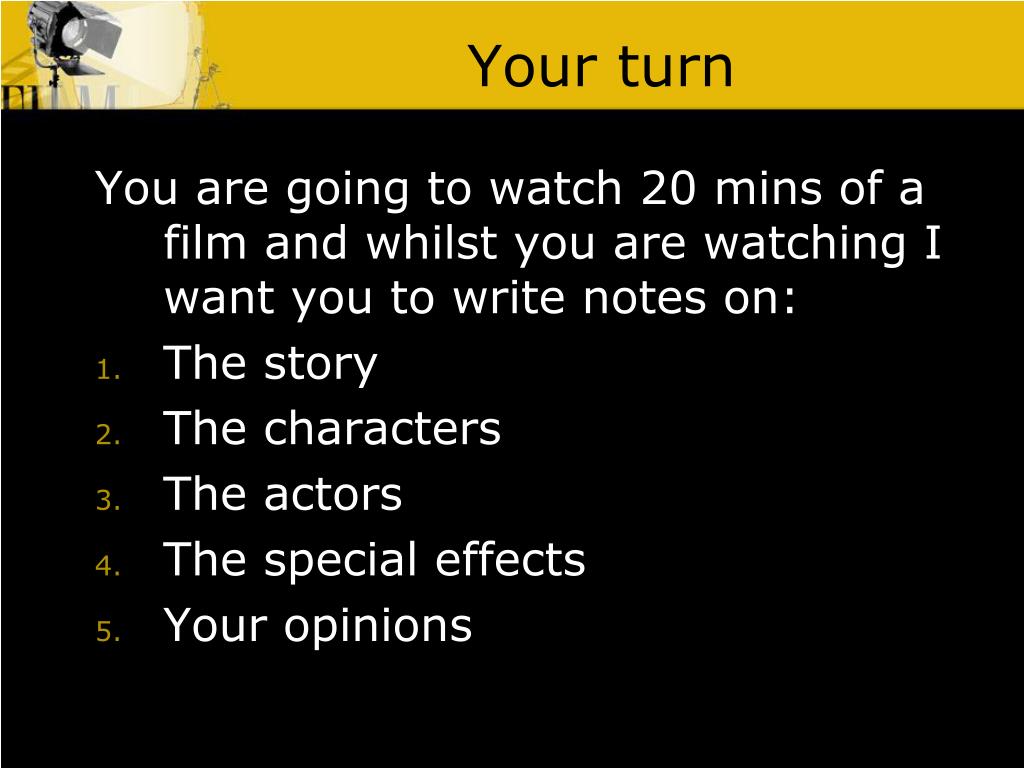 Your turn You are going to watch 20 mins of a film and whilst you are watching I want you to write notes on: • The story • The characters • The actors • The special effects • Your opinions
