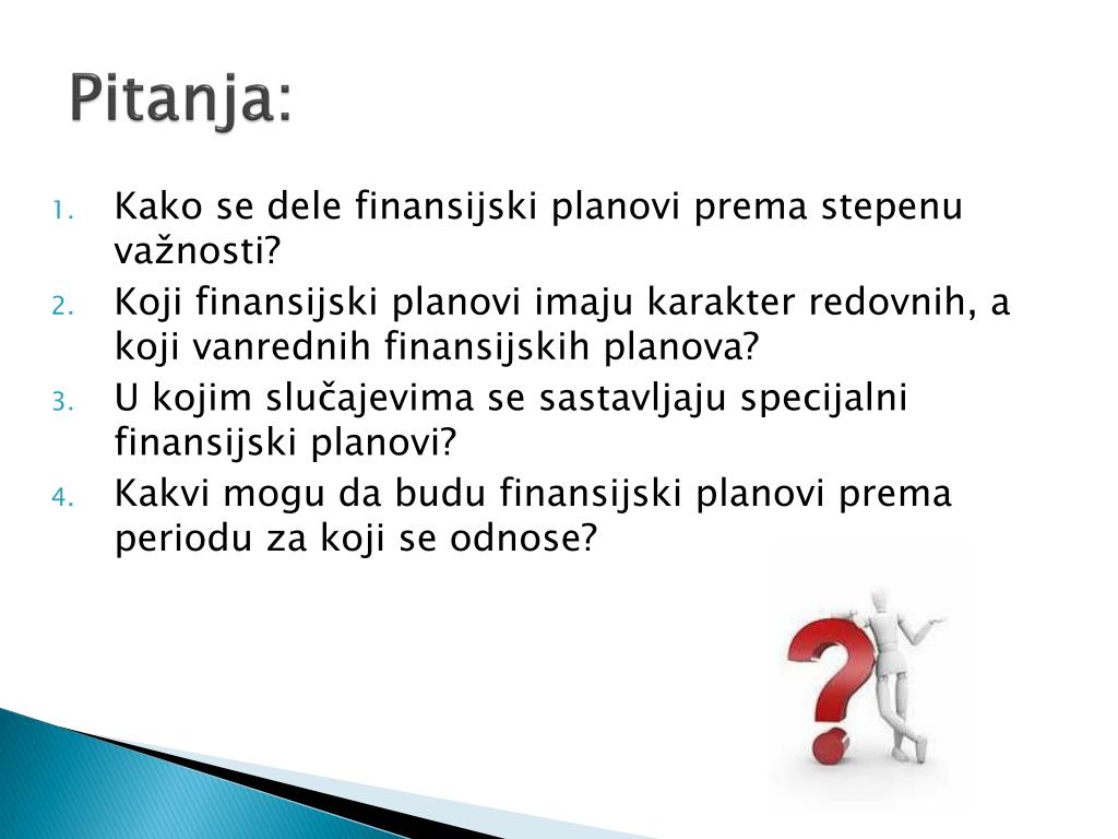 Pitanja: • Kako se dele finansijski planovi prema stepenu važnosti? • Koji finansijski planovi imaju karakter redovnih, a koji vanrednih finansijskih planova? • U kojim slučajevima se sastavljaju specijalni finansijski planovi? • Kakvi mogu da budu finansijski planovi prema periodu za koji se odnose?
