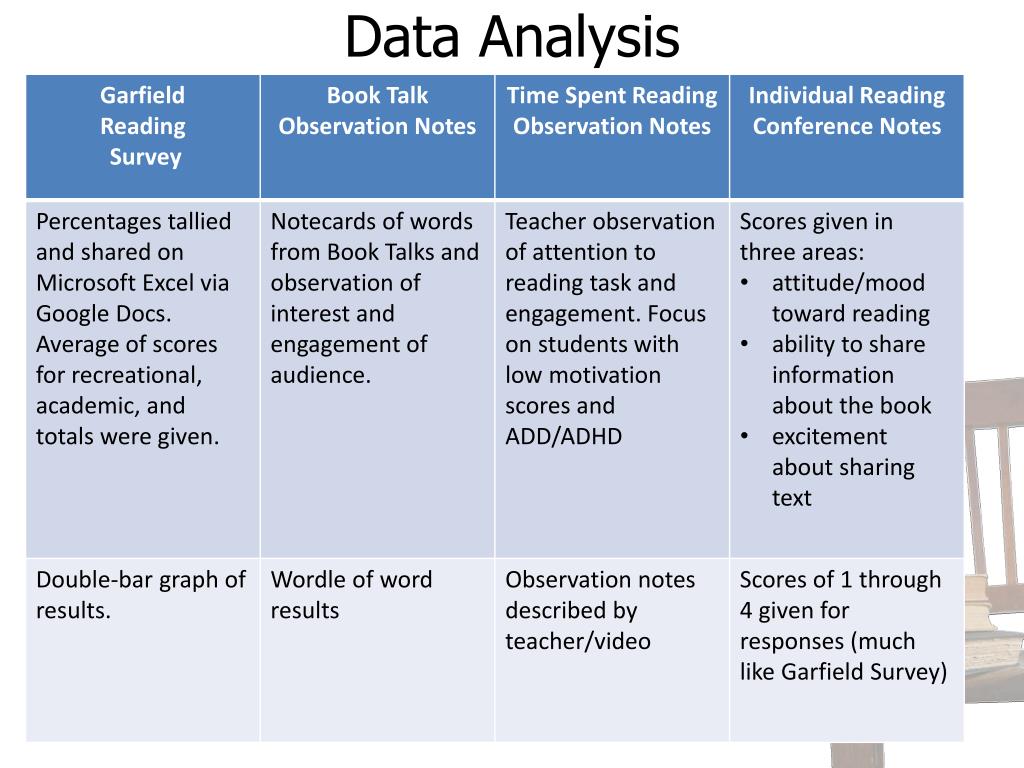 Teacher Reflections • Changes affecting life-long dislike of reading • Quick transition of attitude based on interventions • Time to devote to study and data collection • Locating text that is high interest, age appropriate, low reading level.