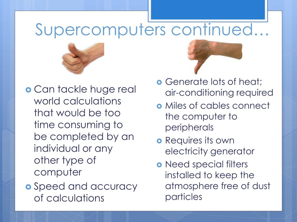 Supercomputers continued… • Generate lots of heat; air-conditioning required • Miles of cables connect the computer to peripherals • Requires its own electricity generator • Need special filters installed to keep the atmosphere free of dust particles • Can tackle huge real world calculations that would be too time consuming to be completed by an individual or any other type of computer • Speed and accuracy of calculations