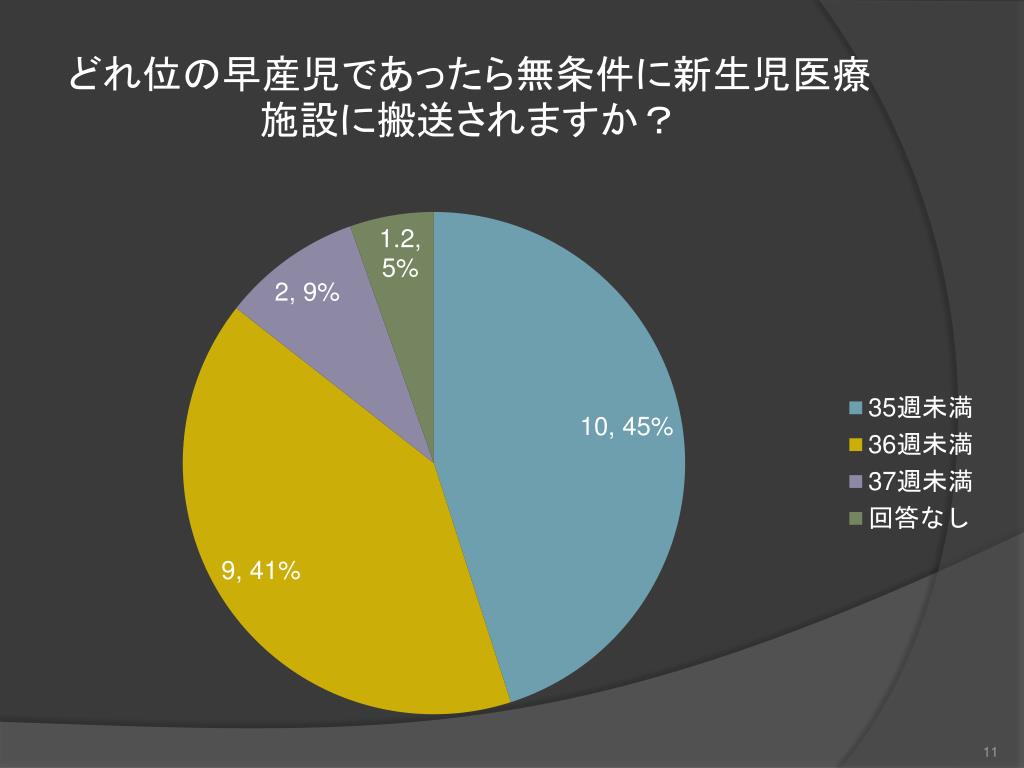 アンケート項目 (1)2011年の貴施設での新生児患者数の受け入れ数 (2)対応可能な医療行為 (3)院外出生成熟児の受け入れ可能な時間帯 (4)院外出生の病的新生児(成熟児)への対応可能な医療行為 (5)新生児病棟の位置付け