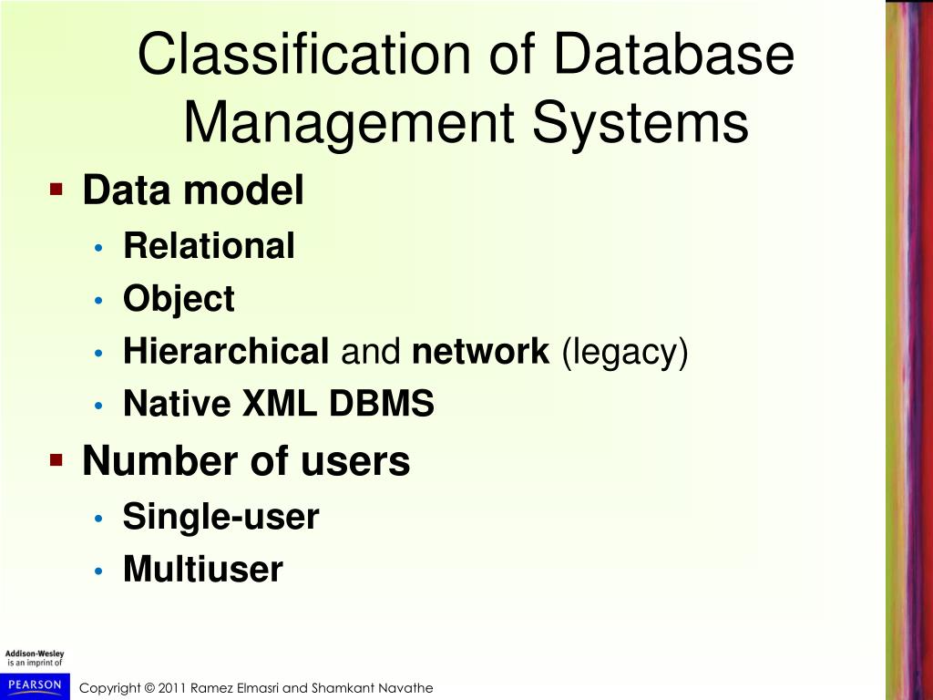 Classification of DatabaseManagement Systems • Data model • Relational • Object • Hierarchical and network (legacy) • Native XML DBMS • Number of users • Single-user • Multiuser