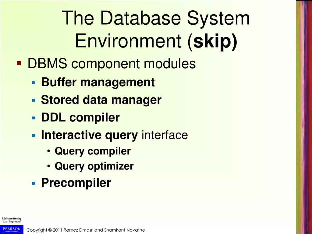The Database System Environment (skip) • DBMS component modules • Buffer management • Stored data manager • DDL compiler • Interactive query interface • Query compiler • Query optimizer • Precompiler