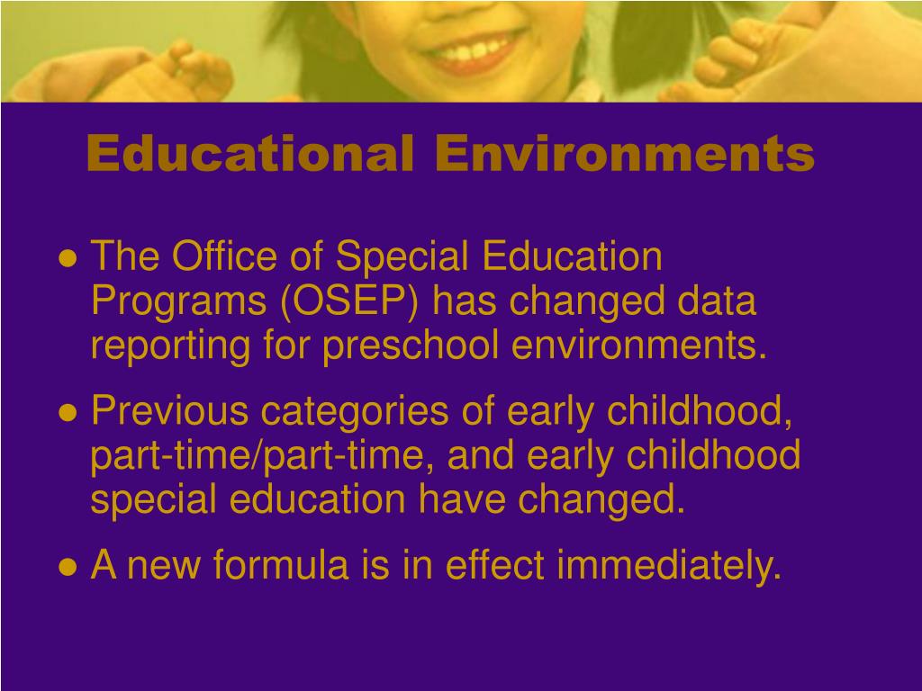 Early Childhood Special Education Educational Environment Codes Training. Educational Environments . The Office of Special Education Programs (OSEP) has changed data reporting for preschool environments.