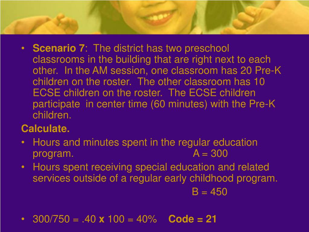 Scenario 7: The district has two preschool classrooms in the building that are right next to each other. In the AM session, one classroom has 20 Pre-K children on the roster. The other classroom has 10 ECSE children on the roster. The ECSE children participate in center time (60 minutes) with the Pre-K children. Calculate. • Hours and minutes spent in the regular education program. A = 300 • Hours spent receiving special education and related services outside of a regular early childhood program. B = 450 • 300/750 = .40 x 100 = 40% Code = 21