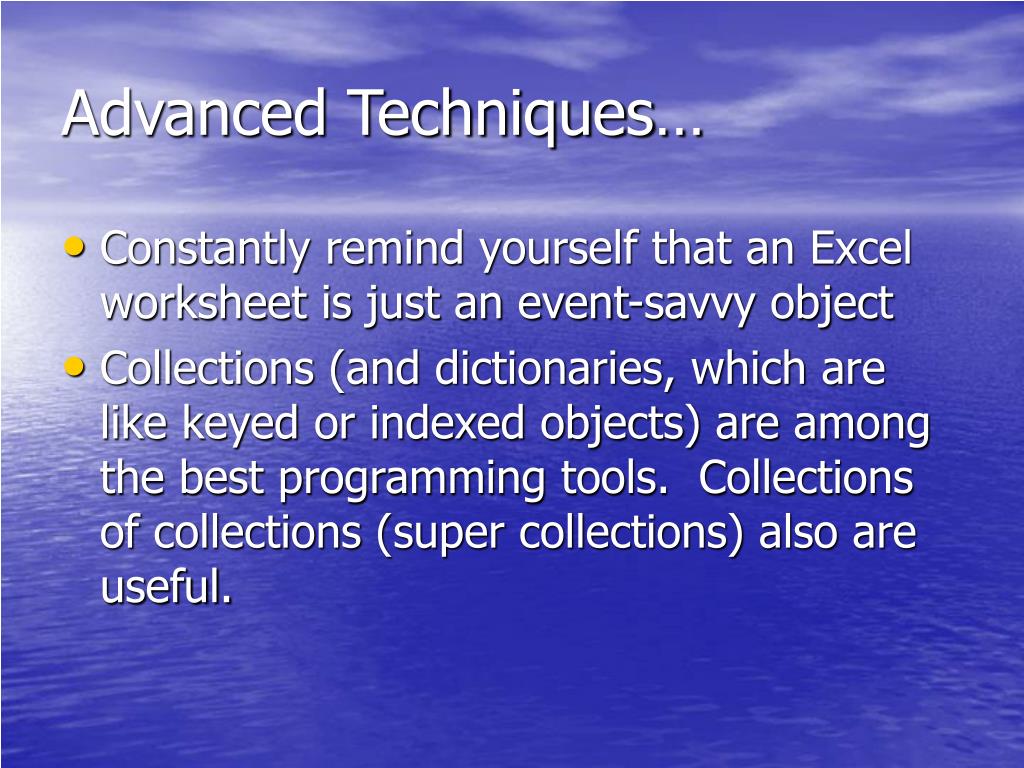 Advanced Techniques… • Constantly remind yourself that an Excel worksheet is just an event-savvy object • Collections (and dictionaries, which are like keyed or indexed objects) are among the best programming tools. Collections of collections (super collections) also are useful.