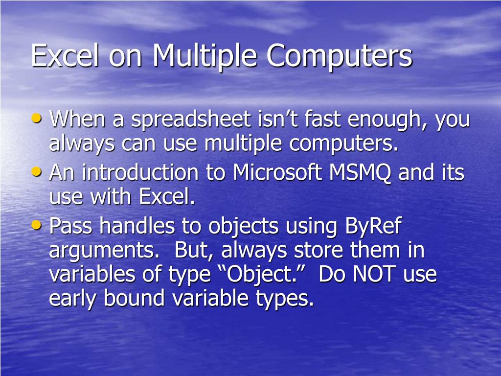 Excel on Multiple Computers • When a spreadsheet isn’t fast enough, you always can use multiple computers. • An introduction to Microsoft MSMQ and its use with Excel. • Pass handles to objects using ByRef arguments. But, always store them in variables of type “Object.” Do NOT use early bound variable types.