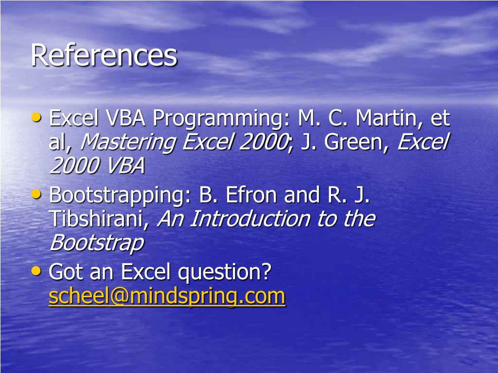References • Excel VBA Programming: M. C. Martin, et al, Mastering Excel 2000; J. Green, Excel 2000 VBA • Bootstrapping: B. Efron and R. J. Tibshirani, An Introduction to the Bootstrap • Got an Excel question? scheel@mindspring.com