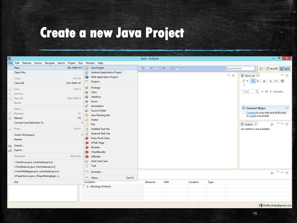 Tools you will need • Eclipse IDE for Java EE Developers • http://www.eclipse.org/downloads/packages/eclipse-ide-java-ee-developers/keplersr1 • hadoop-core-1.2.1.jar • http://mvnrepository.com/artifact/org.apache.hadoop/hadoop-core/1.2.1 • Amazon Web Services Account • https://console.aws.amazon.com/elasticmapreduce/home?region=us-east-1