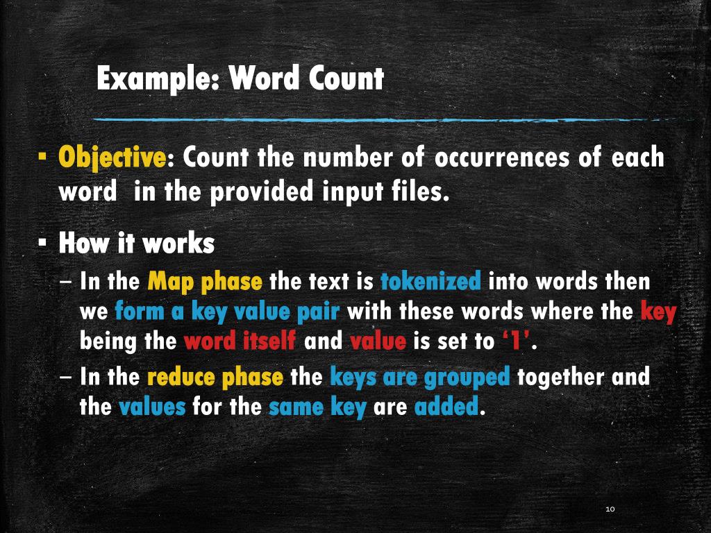 Example: Word Count • Objective: Count the number of occurrences of each word in the provided input files. • How it works • In the Map phase the text is tokenized into words then we form a key value pair with these words where the key being the word itself and valueis set to ‘1’. • In the reduce phase the keys are grouped together and the values for the same key are added.