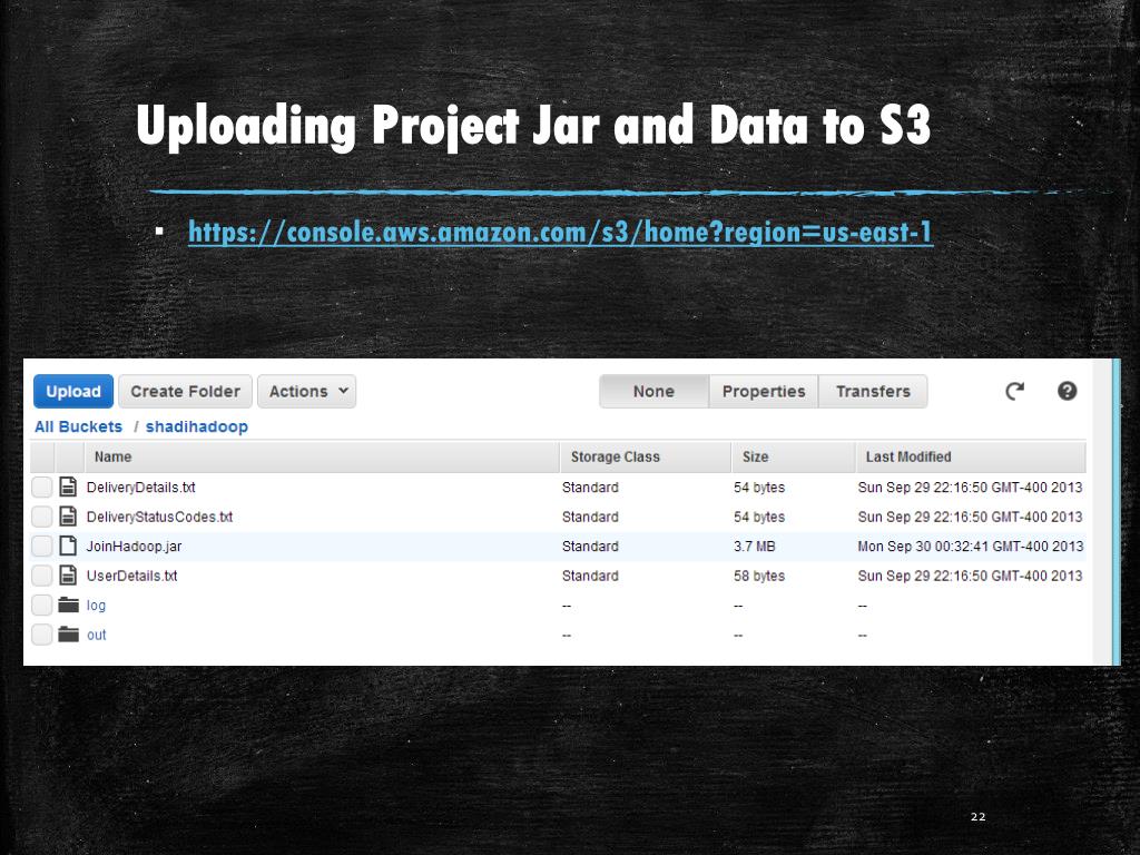 Uploading Project Jar and Data to S3 • https://console.aws.amazon.com/s3/home?region=us-east-1