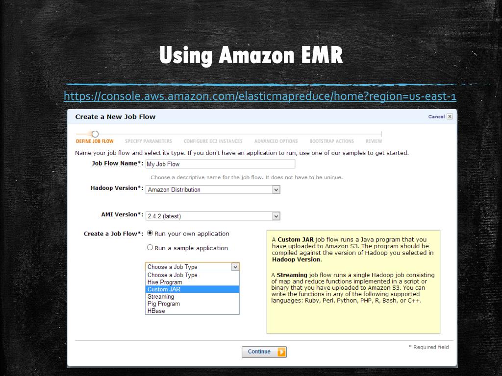 Using Amazon EMR https://console.aws.amazon.com/elasticmapreduce/home?region=us-east-1