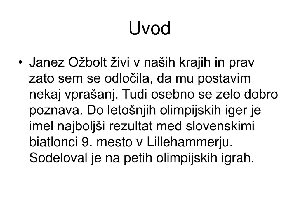 Uvod • Janez Ožbolt živi v naših krajih in prav zato sem se odločila, da mu postavim nekaj vprašanj. Tudi osebno se zelo dobro poznava. Do letošnjih olimpijskih iger je imel najboljši rezultat med slovenskimi biatlonci 9. mesto v Lillehammerju. Sodeloval je na petih olimpijskih igrah.