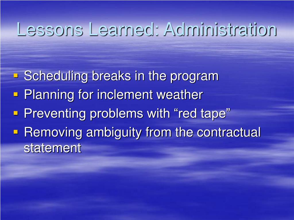 Lessons Learned: Administration • Scheduling breaks in the program • Planning for inclement weather • Preventing problems with “red tape” • Removing ambiguity from the contractual statement