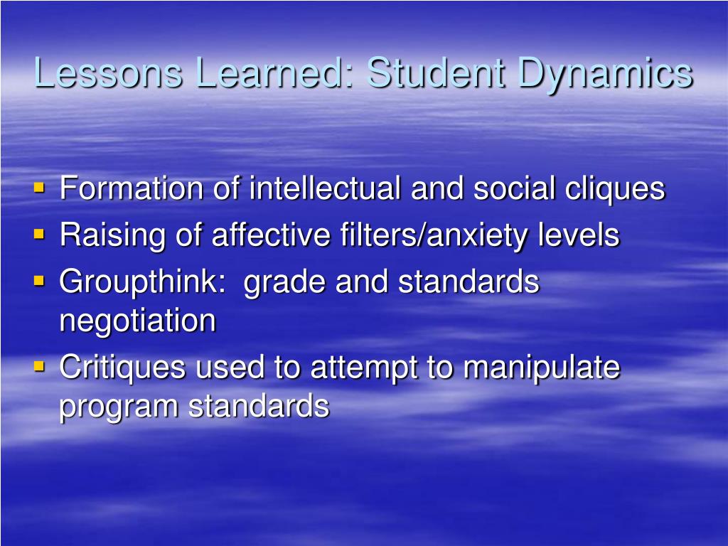Lessons Learned: Student Dynamics • Formation of intellectual and social cliques • Raising of affective filters/anxiety levels • Groupthink: grade and standards negotiation • Critiques used to attempt to manipulate program standards