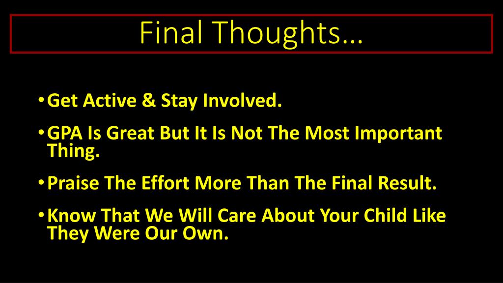 Final Thoughts… • Get Active & Stay Involved. • GPA Is Great But It Is Not The Most Important Thing. • Praise The Effort More Than The Final Result. • Know That We Will Care About Your Child Like They Were Our Own.