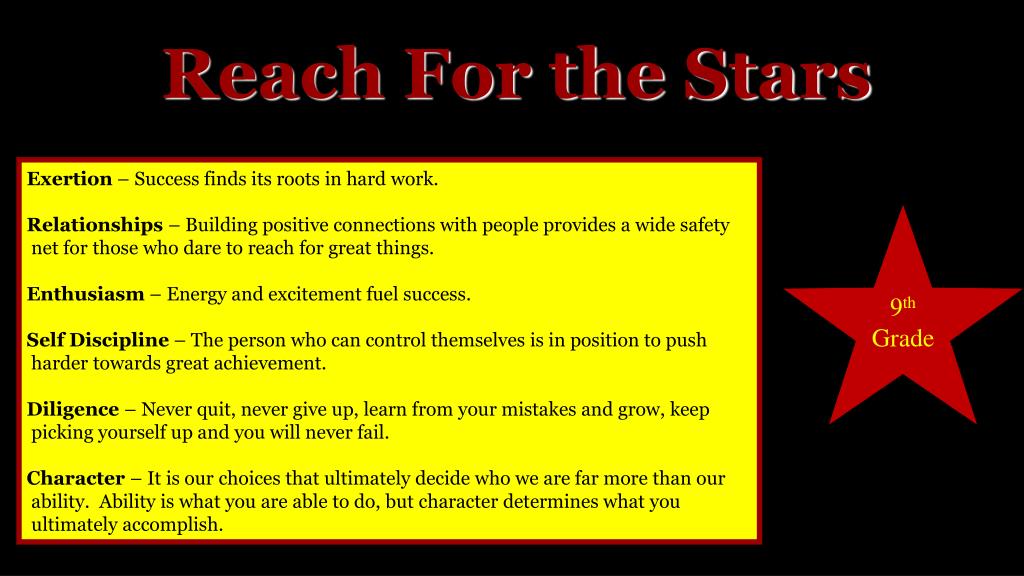 Reach For the Stars Exertion – Success finds its roots in hard work. Relationships – Building positive connections with people provides a wide safety net for those who dare to reach for great things.Enthusiasm – Energy and excitement fuel success.Self Discipline – The person who can control themselves is in position to push harder towards great achievement.Diligence – Never quit, never give up, learn from your mistakes and grow, keep picking yourself up and you will never fail.Character – It is our choices that ultimately decide who we are far more than our ability. Ability is what you are able to do, but character determines what you ultimately accomplish. 9th Grade