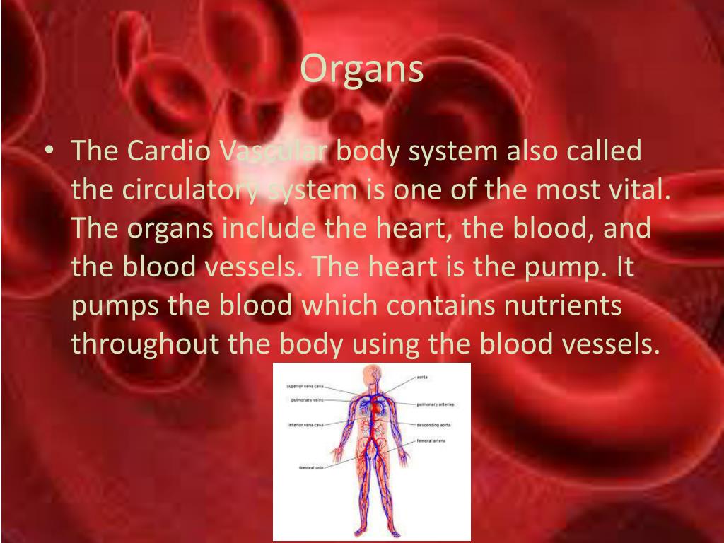 Organs • The Cardio Vascular body system also called the circulatory system is one of the most vital. The organs include the heart, the blood, and the blood vessels. The heart is the pump. It pumps the blood which contains nutrients throughout the body using the blood vessels.