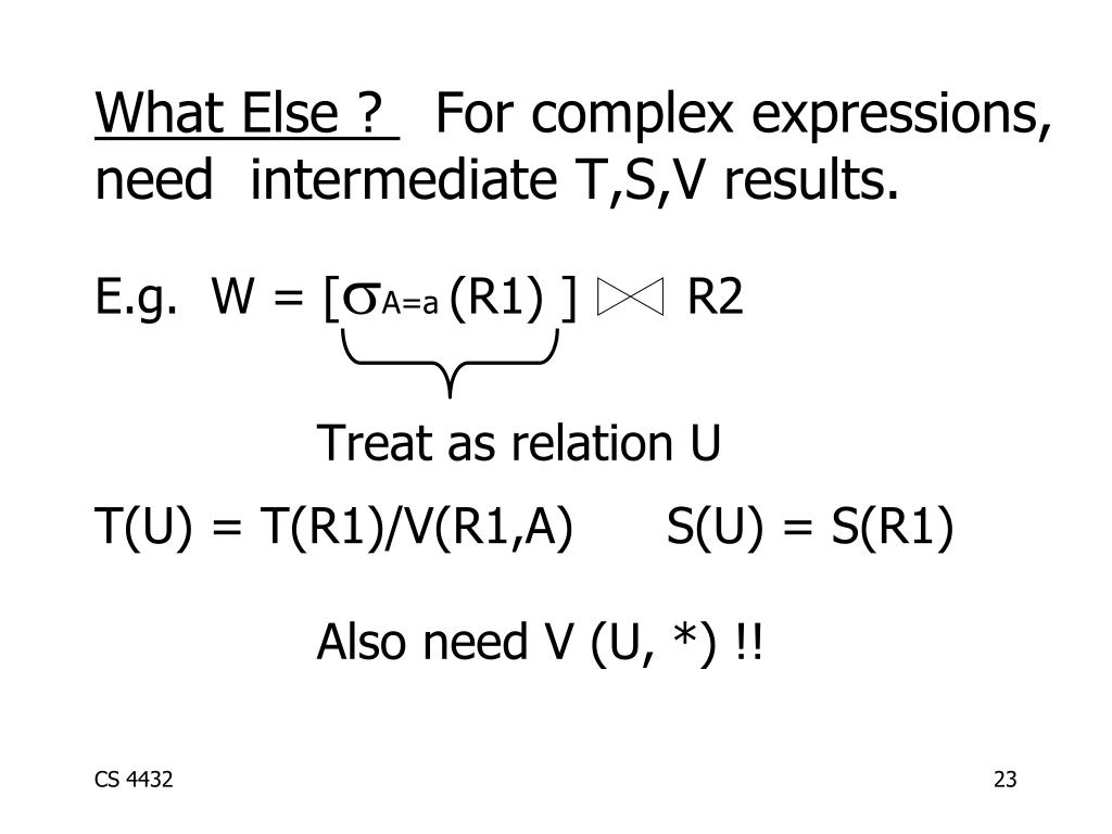 What Else ? For complex expressions, need intermediate T,S,V results. E.g. W = [sA=a(R1) ] R2 Treat as relation U T(U) = T(R1)/V(R1,A) S(U) = S(R1) Also need V (U, *) !!