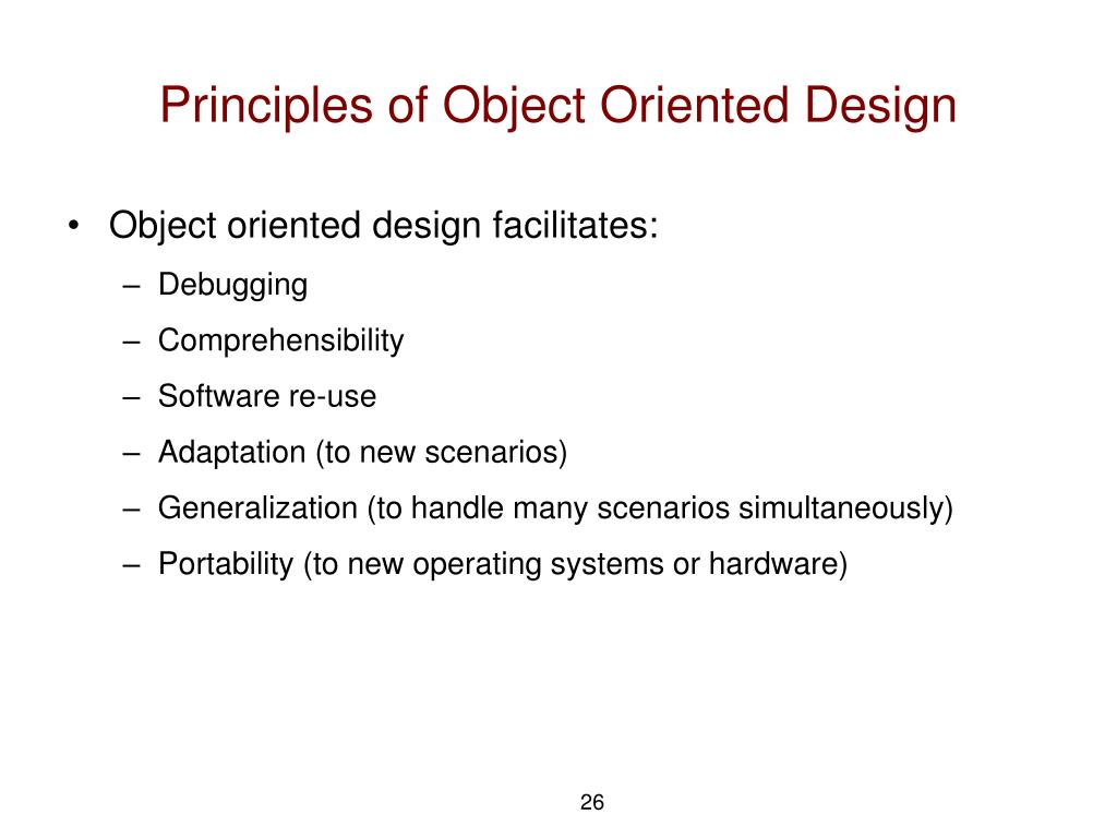 Principles of Object Oriented Design • Object oriented design facilitates: • Debugging • Comprehensibility • Software re-use • Adaptation (to new scenarios) • Generalization (to handle many scenarios simultaneously) • Portability (to new operating systems or hardware)