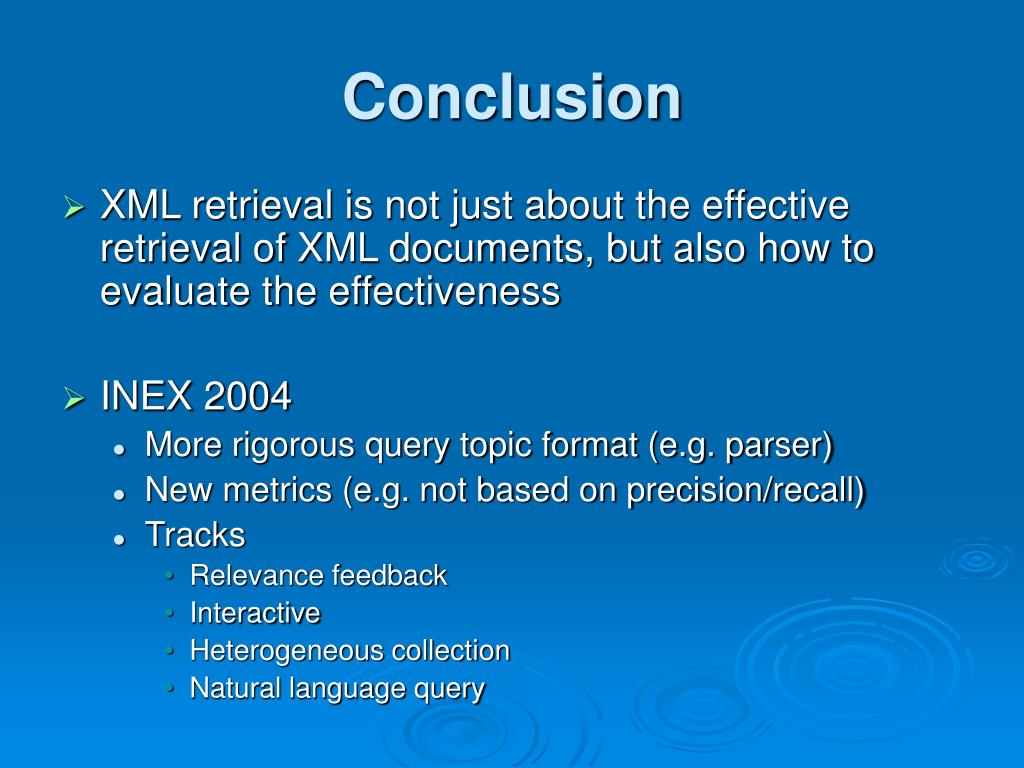 Conclusion • XML retrieval is not just about the effective retrieval of XML documents, but also how to evaluate the effectiveness • INEX 2004 • More rigorous query topic format (e.g. parser) • New metrics (e.g. not based on precision/recall) • Tracks • Relevance feedback • Interactive • Heterogeneous collection • Natural language query