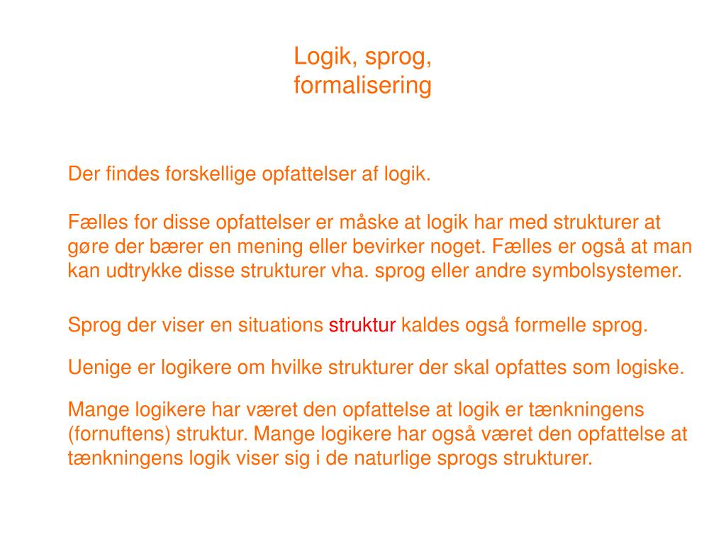 Logik, sprog,formalisering Der findes forskellige opfattelser af logik. Fælles for disse opfattelser er måske at logik har med strukturer at gøre der bærer en mening eller bevirker noget. Fælles er også at man kan udtrykke disse strukturer vha. sprog eller andre symbolsystemer. Sprog der viser en situations struktur kaldes også formelle sprog. Uenige er logikere om hvilke strukturer der skal opfattes som logiske. Mange logikere har været den opfattelse at logik er tænkningens (fornuftens) struktur. Mange logikere har også været den opfattelse at tænkningens logik viser sig i de naturlige sprogs strukturer.