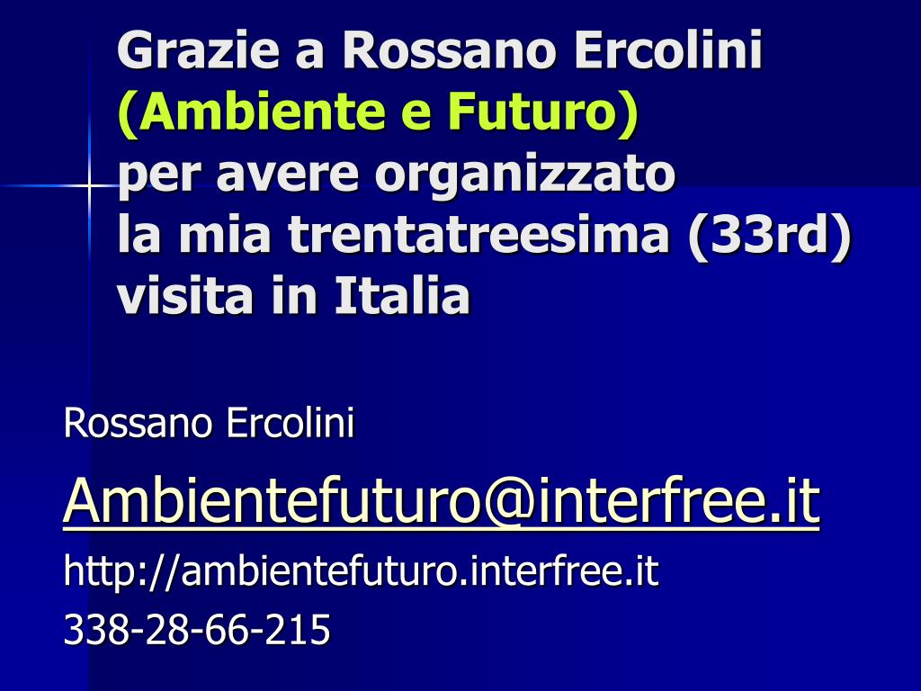 Grazie a Rossano Ercolini (Ambiente e Futuro)per avere organizzato la mia trentatreesima (33rd) visita in Italia Rossano Ercolini Ambientefuturo@interfree.it http://ambientefuturo.interfree.it 338-28-66-215