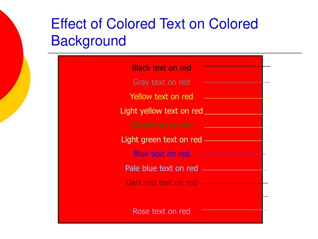 Effect of Colored Text on Colored Background Black text on red Gray text on red Yellow text on red Light yellow text on red Green text on red Light green text on red Blue text on red Pale blue text on red Dark red text on red Red text on red Rose text on red