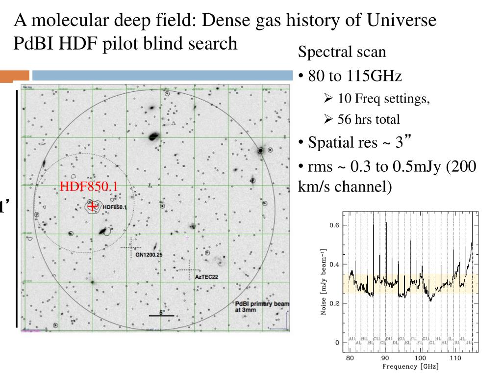 A molecular deep field: Dense gas history of Universe PdBIHDF pilot blind search • Spectral scan • 80 to 115GHz • 10 Freq settings, • 56 hrs total • Spatial res ~ 3” • rms ~ 0.3 to 0.5mJy (200 km/s channel) HDF850.1 + 1’