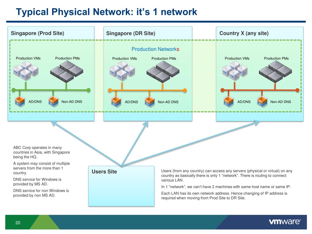 Typical Physical Network: it’s 1 network Singapore (Prod Site) Country X (any site) Singapore (DR Site) Production Networks Production PMs Production VMs Production PMs Production VMs Production PMs Production VMs AD/DNS Non-AD DNS AD/DNS Non-AD DNS AD/DNS Non-AD DNS ABC Corp operates in many countries in Asia, with Singapore being the HQ. A system may consist of multiple servers from the more than 1 country. DNS service for Windows is provided by MS AD. DNS service for non Windows is provided by non MS AD. Users (from any country) can access any servers (physical or virtual) on any country as basically there is only 1 “network”. There is routing to connect various LAN. In 1 “network”, we can’t have 2 machines with same host name or same IP. Each LAN has its own network address. Hence changing of IP address is required when moving from Prod Site to DR Site. Users Site