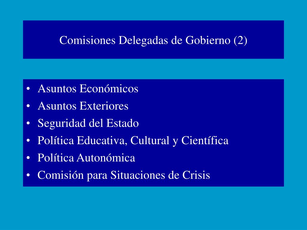 Comisiones Delegadas de Gobierno (2) • Asuntos Económicos • Asuntos Exteriores • Seguridad del Estado • Política Educativa, Cultural y Científica • Política Autonómica • Comisión para Situaciones de Crisis