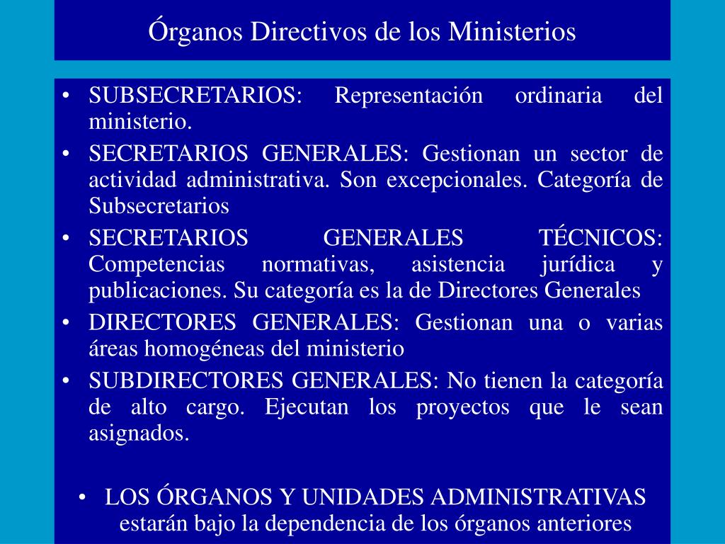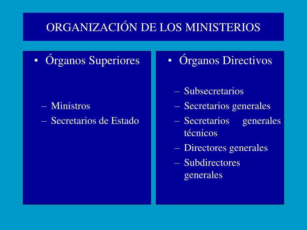 ORGANIZACIÓN DE LOS MINISTERIOS • Órganos Directivos • Subsecretarios • Secretarios generales • Secretarios generales técnicos • Directores generales • Subdirectores generales • Órganos Superiores • Ministros • Secretarios de Estado