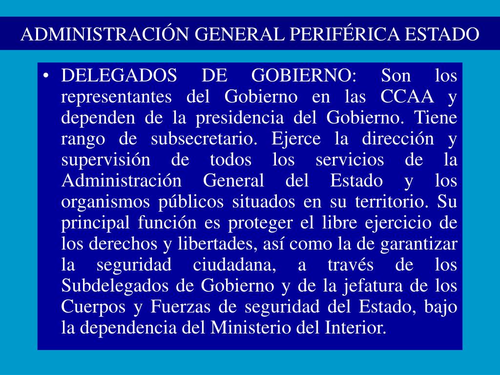 ADMINISTRACIÓN GENERAL PERIFÉRICA ESTADO • DELEGADOS DE GOBIERNO: Son los representantes del Gobierno en las CCAA y dependen de la presidencia del Gobierno. Tiene rango de subsecretario. Ejerce la dirección y supervisión de todos los servicios de la Administración General del Estado y los organismos públicos situados en su territorio. Su principal función es proteger el libre ejercicio de los derechos y libertades, así como la de garantizar la seguridad ciudadana, a través de los Subdelegados de Gobierno y de la jefatura de los Cuerpos y Fuerzas de seguridad del Estado, bajo la dependencia del Ministerio del Interior.