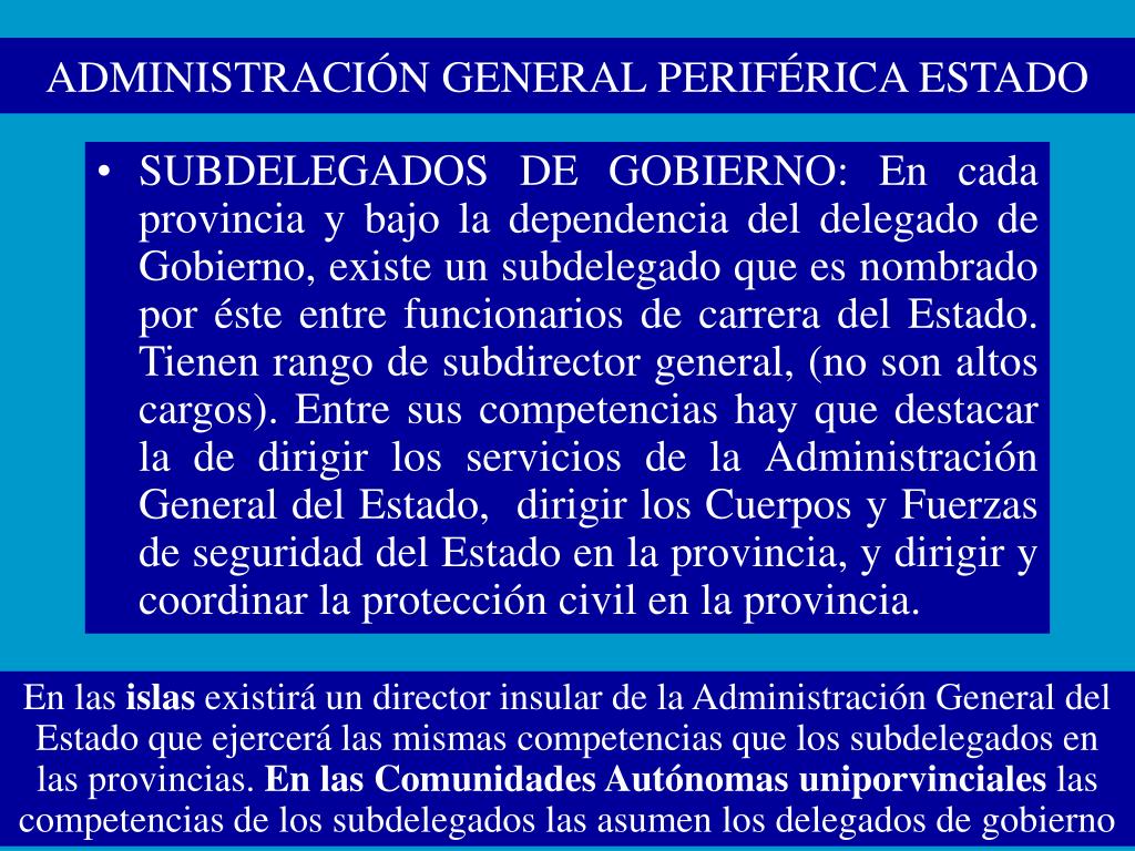 ADMINISTRACIÓN GENERAL PERIFÉRICA ESTADO • SUBDELEGADOS DE GOBIERNO: En cada provincia y bajo la dependencia del delegado de Gobierno, existe un subdelegado que es nombrado por éste entre funcionarios de carrera del Estado. Tienen rango de subdirector general, (no son altos cargos). Entre sus competencias hay que destacar la de dirigir los servicios de la Administración General del Estado, dirigir los Cuerpos y Fuerzas de seguridad del Estado en la provincia, y dirigir y coordinar la protección civil en la provincia. En las islas existirá un director insular de la Administración General del Estado que ejercerá las mismas competencias que los subdelegados en las provincias. En las Comunidades Autónomas uniporvinciales las competencias de los subdelegados las asumen los delegados de gobierno
