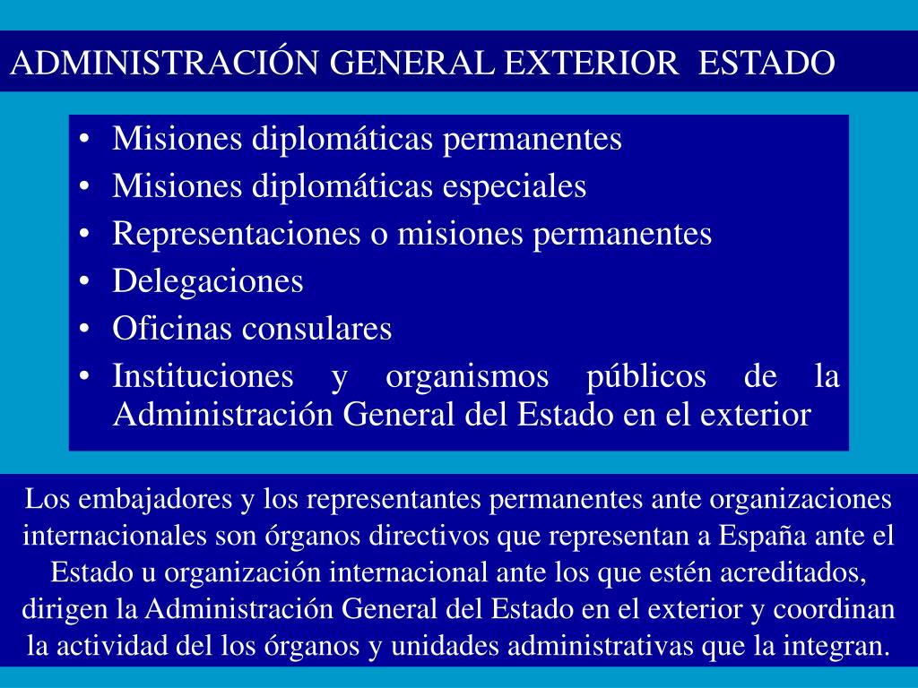 ADMINISTRACIÓN GENERAL EXTERIOR ESTADO • Misiones diplomáticas permanentes • Misiones diplomáticas especiales • Representaciones o misiones permanentes • Delegaciones • Oficinas consulares • Instituciones y organismos públicos de la Administración General del Estado en el exterior Los embajadores y los representantes permanentes ante organizaciones internacionales son órganos directivos que representan a España ante el Estado u organización internacional ante los que estén acreditados, dirigen la Administración General del Estado en el exterior y coordinan la actividad del los órganos y unidades administrativas que la integran.