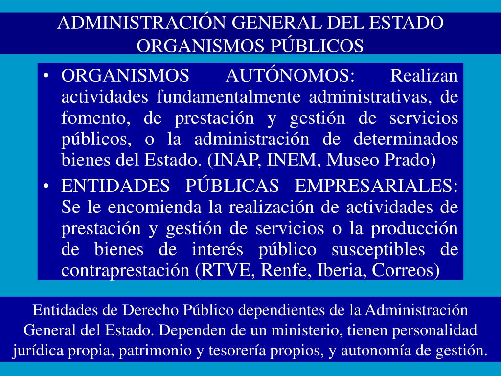 ADMINISTRACIÓN GENERAL DEL ESTADO ORGANISMOS PÚBLICOS • ORGANISMOS AUTÓNOMOS: Realizan actividades fundamentalmente administrativas, de fomento, de prestación y gestión de servicios públicos, o la administración de determinados bienes del Estado. (INAP, INEM, Museo Prado) • ENTIDADES PÚBLICAS EMPRESARIALES: Se le encomienda la realización de actividades de prestación y gestión de servicios o la producción de bienes de interés público susceptibles de contraprestación (RTVE, Renfe, Iberia, Correos) Entidades de Derecho Público dependientes de la Administración General del Estado. Dependen de un ministerio, tienen personalidad jurídica propia, patrimonio y tesorería propios, y autonomía de gestión.