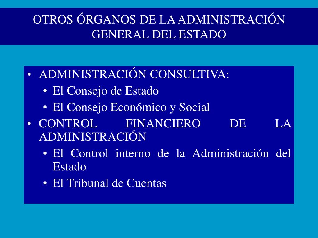 OTROS ÓRGANOS DE LA ADMINISTRACIÓN GENERAL DEL ESTADO • ADMINISTRACIÓN CONSULTIVA: • El Consejo de Estado • El Consejo Económico y Social • CONTROL FINANCIERO DE LA ADMINISTRACIÓN • El Control interno de la Administración del Estado • El Tribunal de Cuentas