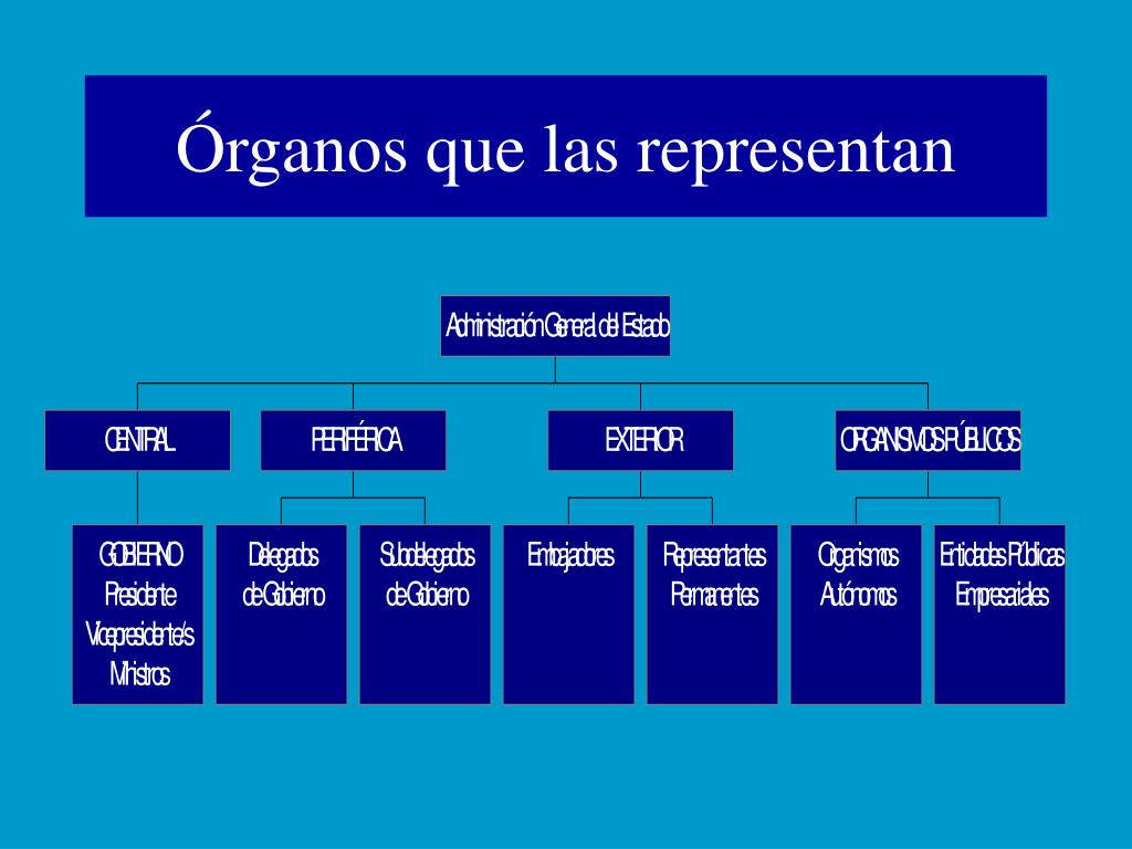 Composición • Central: • Su competencia se extiende a todo el territorio nacional (gobierno) • Periférica: • Su competencia comprende una parte del territorio (delegados del gobierno y subdelegados) • Exterior: • Representan a España ante otros Estados y organismos internacionales (embajadores y representantes permanentes) • Organismos Públicos: • No tienen una demarcación territorial concreta