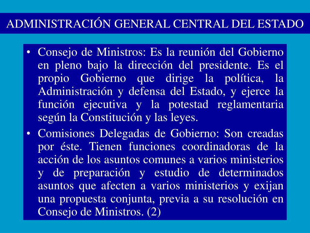 ADMINISTRACIÓN GENERAL CENTRAL DEL ESTADO • Consejo de Ministros: Es la reunión del Gobierno en pleno bajo la dirección del presidente. Es el propio Gobierno que dirige la política, la Administración y defensa del Estado, y ejerce la función ejecutiva y la potestad reglamentaria según la Constitución y las leyes. • Comisiones Delegadas de Gobierno: Son creadas por éste. Tienen funciones coordinadoras de la acción de los asuntos comunes a varios ministerios y de preparación y estudio de determinados asuntos que afecten a varios ministerios y exijan una propuesta conjunta, previa a su resolución en Consejo de Ministros. (2)
