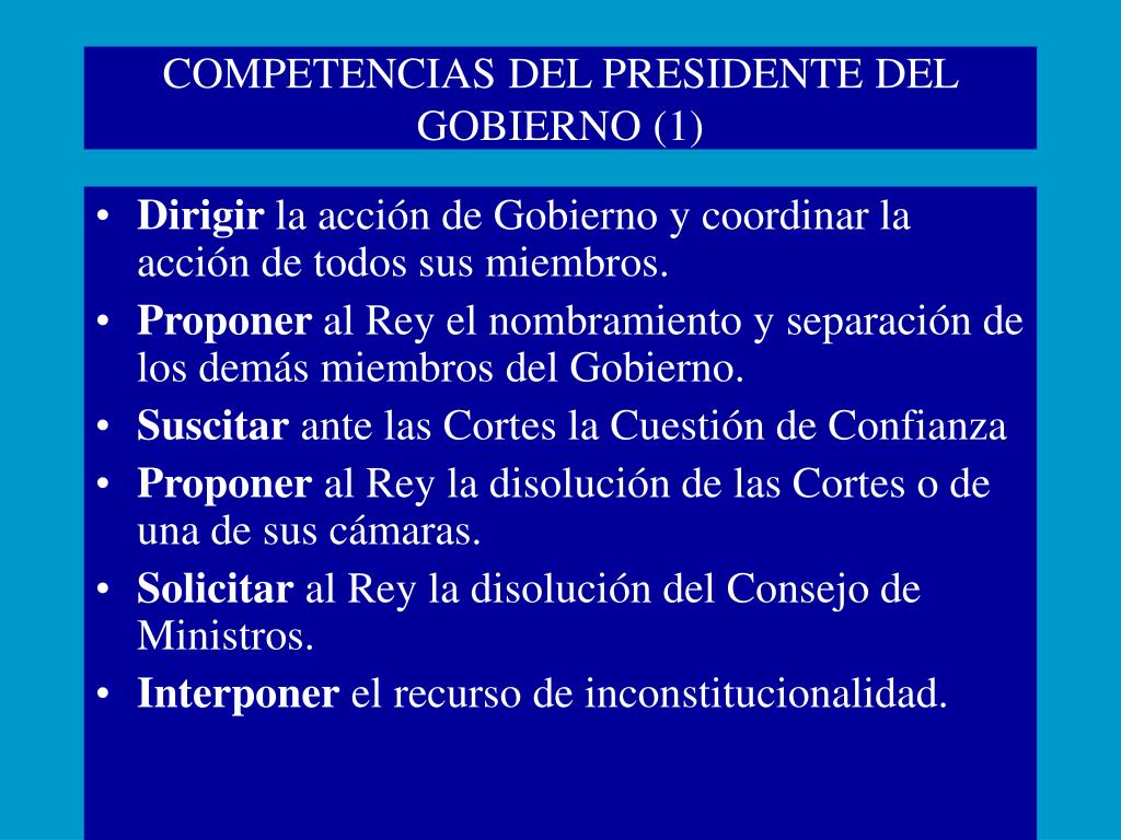 COMPETENCIAS DEL PRESIDENTE DEL GOBIERNO (1) • Dirigir la acción de Gobierno y coordinar la acción de todos sus miembros. • Proponer al Rey el nombramiento y separación de los demás miembros del Gobierno. • Suscitar ante las Cortes la Cuestión de Confianza • Proponer al Rey la disolución de las Cortes o de una de sus cámaras. • Solicitar al Rey la disolución del Consejo de Ministros. • Interponer el recurso de inconstitucionalidad.