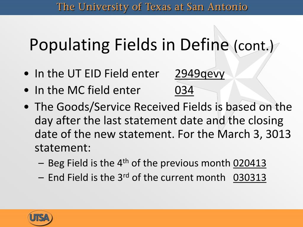 Populating Fields in Define (cont.) • In the UT EID Field enter 2949qevy • In the MC field enter 034 • The Goods/Service Received Fields is based on the day after the last statement date and the closing date of the new statement. For the March 3, 3013 statement: • Beg Field is the 4th of the previous month 020413 • End Field is the 3rd of the current month 030313