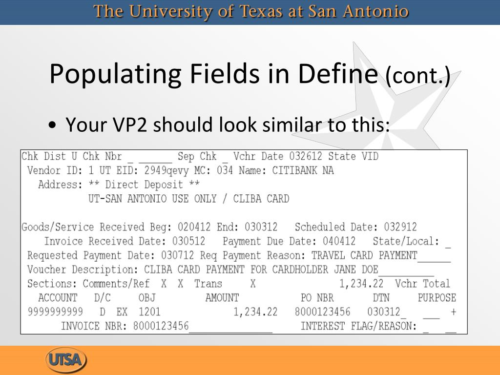 Populating Fields in Define (cont.) • Enter the last ten digits of the card number in the PO NBR field. • Enter the current statement date in the DTN field.