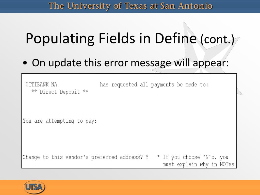 Populating Fields in Define (cont.) • On update this error message will appear: