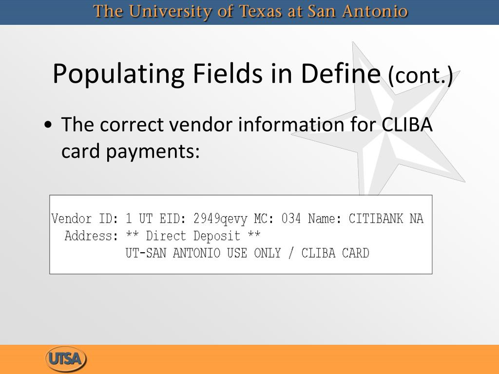 Populating Fields in Define (cont.) • The correct vendor information for CLIBA card payments: